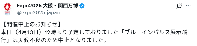 万博開幕当日、降水確率90%の悪天候が予想され、ブルーインパルスの飛行は中止に。6機中3機が関西空港から離陸し、通天閣上空を視察しましたが、降雨と視界不良のため飛行隊長の江尻卓氏が中止を決断。万博公式Xは「天候により中止となりました。ご理解を」と投稿(@expo2025_japan)。