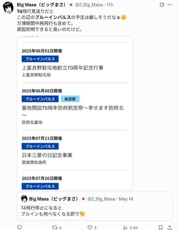 @Z_Big_Masaは「この辺のブルーインパルスの予定は厳しそうだなぁ」と投稿。