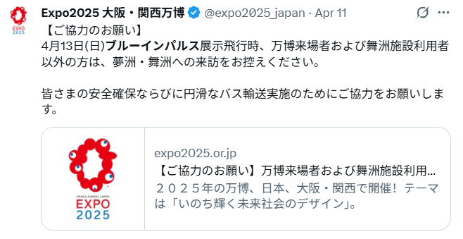 予行飛行の反響を受け、協会は4月11日に改めて注意喚起。「万博来場者や舞洲施設利用者以外は、夢洲や舞洲での観覧を控えてください」と発表しました。